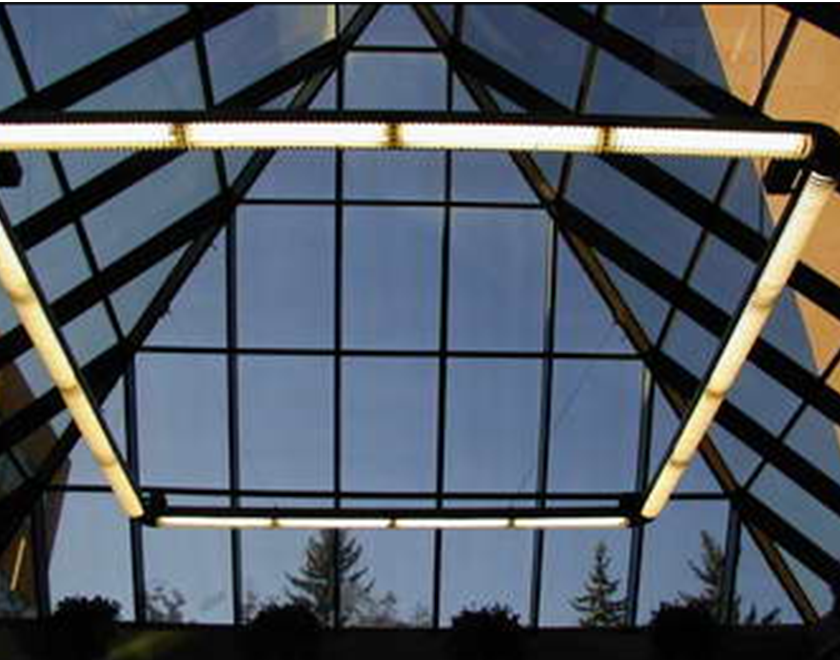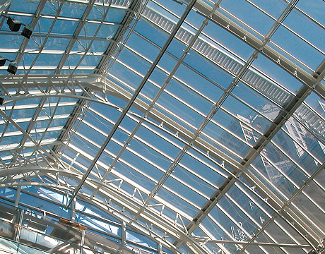 A second frame was formed on the main carrier steel construction using aluminum profiles. In appropriate dimensions, glass or opaque materials are adapted into this frame. System solutions can be applied with main carrier aluminum profiles in conjunction with closed gaps. Profile sections are sized in roof windows, calculating according to norms of local regulations with snow, wind and live loads. Rainwater drainage and cleaning system should be resolved. Smoke pans or ventilation holes can be opened for light systems.